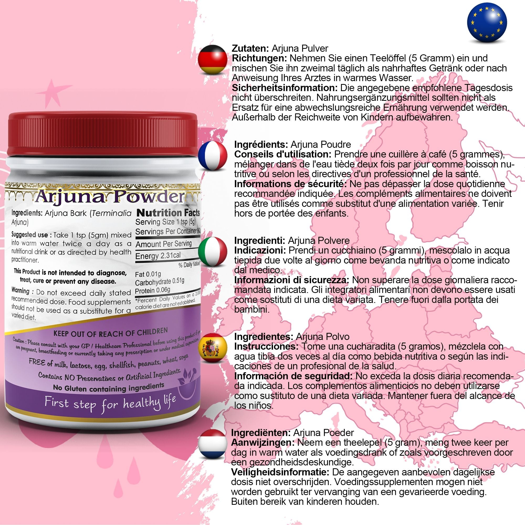 Arjuna contient une multitude de composés bioactifs comme le cardénolide, les tanins, les flavonoïdes, les saponines triterpénoïdes, l'acide ellagique et l'acide gallique qui offrent des propriétés saines étonnantes. Arjuna contient des constituants bioactifs connus pour présenter des activités utiles et physiologiques. Il contient une multitude de constituants chimiques actifs comme l’acide arjunique, l’acide arjunollique, l’arjunétine, les arjunones et d’autres glycosides et tanins. Il protège les dommages causés à l'ADN par les toxines. Arjuna est riche en co-enzyme Q-10 qui est un catalyseur dans la production et le transport de l'énergie nécessaire au fonctionnement normal des organes.