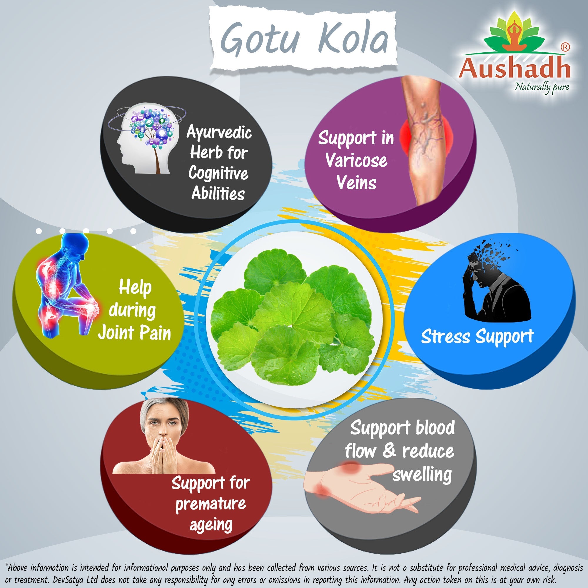 Gotu Kola est un adaptogène doux. Il est également légèrement antibactérien, antiviral, anti-inflammatoire, anti-ulcérogène, anxiolytique, tonique cérébral, stimulant favorisant la circulation, diurétique, troubles nerveux nerveux et vulnéraires, épilepsie, sénilité et vieillissement prématuré. En tant que tonique cérébral, on dit qu’il favorise l’intelligence et la mémoire. On dit qu’il réduit le stress et la dépression. On dit également qu’il est utile contre les varices, les rhumatismes et diverses maladies du sang. Il est largement consommé pour son aide aux capacités cognitives.