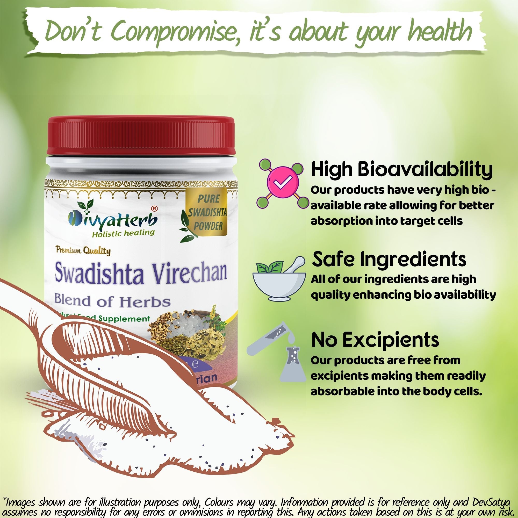 Swadishta Virechan est l'un des médicaments ayurvédiques utilisés pour la constipation et la désintoxication. Il est bénéfique en cas de constipation légère à modérée, de maladies de peau caractérisées par des démangeaisons excessives, de formation excessive d'AMA (toxine), de maux de tête dus à la constipation ou aux gaz abdominaux et à la gale. Il est également utilisé comme agent rafraîchissant après l’utilisation du Séné, un laxatif plus puissant et plus puissant.