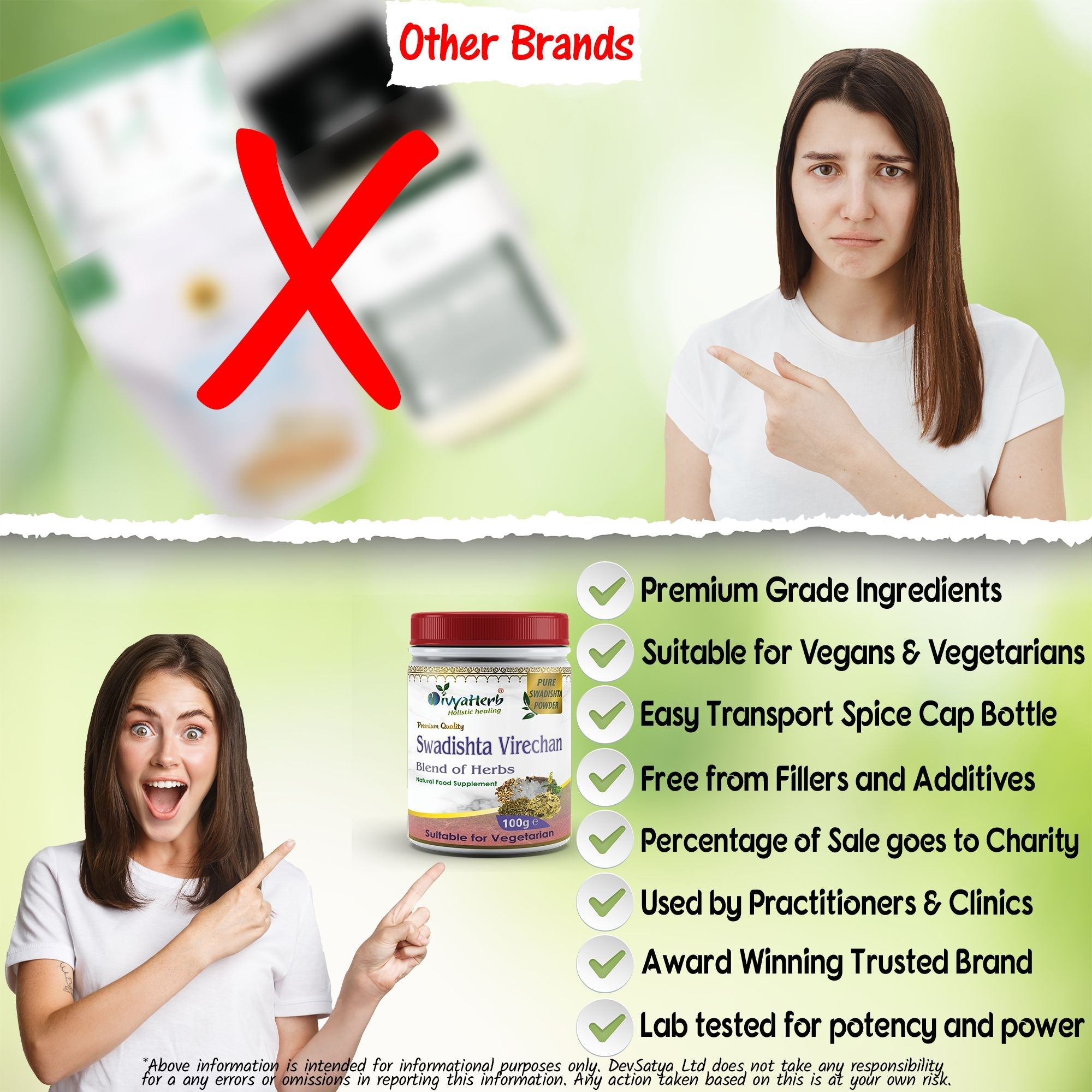 Swadistha Virechan est une autre composition ayurvédique très populaire qui a été utilisée au fil des années pour les problèmes liés à la désintoxication, à la digestion et à la constipation. Il contient du Zingiber Officinale (racine de gingembre), Piper Nigrum (poivre noir), Piper Longum (fruit Pippali), Emblica Officinalis (fruit Amalaki), Terminalia Belerica (fruit Bibhitaki), Terminalia Chebula (fruit Haritaki), Cyperus Rotundus (racine de Musta) , Syzygium Aromaticum (bourgeon de girofle), Cinnamomum Tamala (Tejpatta), Elettaria Cardamomum (graine d'Ilachi / Cardamome), Operculina Turpethum (herbe Nishoth), sucre candi et sel. Les herbes présentent de nombreux avantages individuels, mais lorsqu'elles sont combinées pour former Swadistha Virechan, elles sont considérées comme un laxatif doux et contribuent au métabolisme global et donc à une santé abdominale saine.