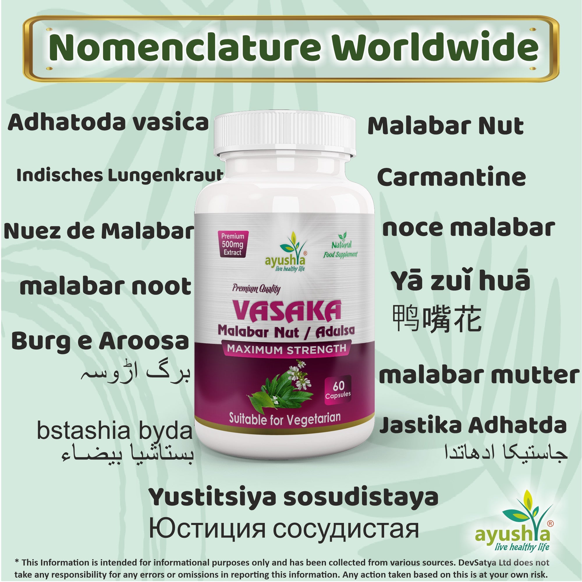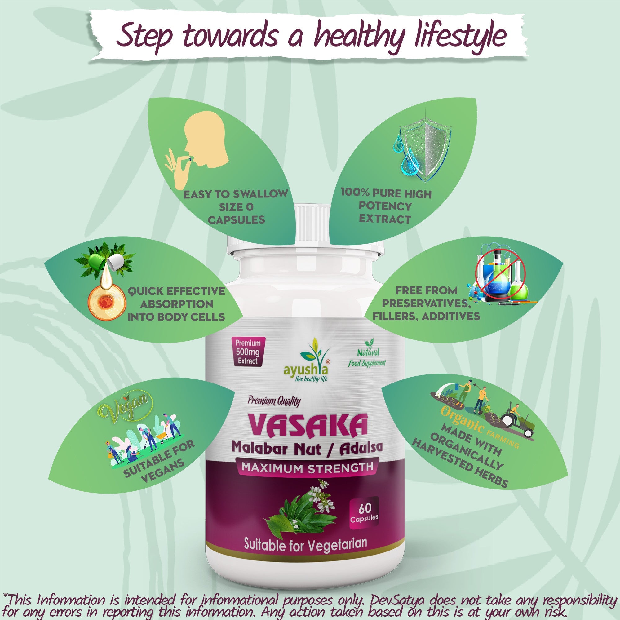 Vasaka Adulsa, qui porte le nom botanique Adathoda vasica, est un grand arbuste herbacé à feuilles persistantes qui est non seulement originaire du sous-continent indien, mais également distribué dans tout le Népal, le Sri Lanka, le Pakistan, la Malaisie, l'Indonésie et la Chine. La plante présente une écorce de couleur jaune, des feuilles en forme de lance, des fleurs blanches et violettes et des fruits capsulaires pubescents en forme de massue. Vasaka, également connue sous le nom de « Malabar Nut » en anglais, « Adhathodai » en tamoul, « Vasa » en telugu et « Arusha » en hindi, est une plante ayurvédique puissante qui améliore le système respiratoire.